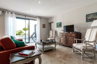 Grand séjour avec cuisine ouverte donnant accès à une terrasse ombragée, deux chambres avec chacune leur salle de bain avec douche à l'italienne.